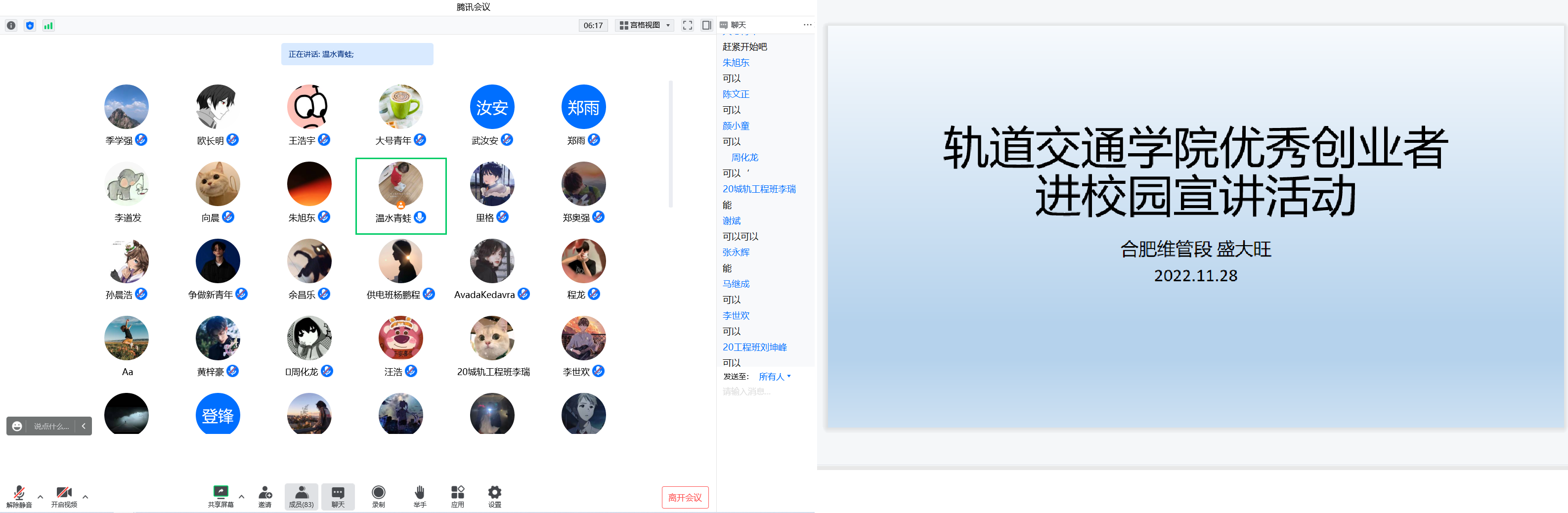 为深入贯彻党中央、国务院和省委、省政府“稳就业”“保就业”决策部署,贯彻落实《关于开展优秀创业者进校园宣讲活动的通知》精神,推动大众创业、万众创新走深走实,强化校园就业创业指导服务,激发大学生群体的创业热情,提升创业能力,促进毕业生更加充分更高质量就业,11月28日下午,我院举办线上“优秀创业者进校园”活动。活动邀请到中铁电气化铁路运营管理有限公司合肥维管段人劳室主任盛大旺开展创业经验分享。