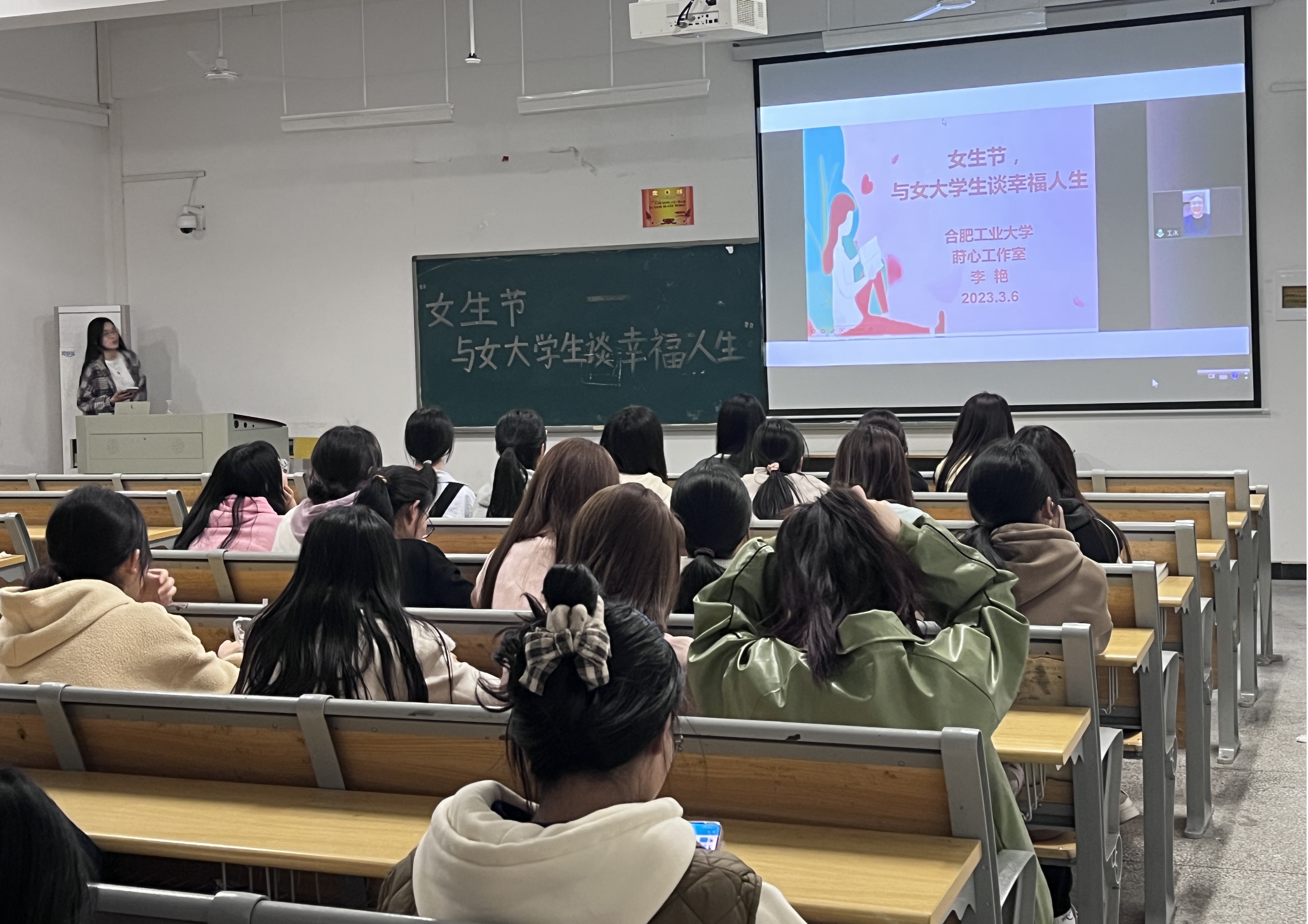 此次讲座由合肥工业大学副教授、国家二级心理咨询师、中国心理学会注册心理师李艳老师担任主讲人。讲座中,李老师围绕何为幸福、培养幸福力、自我成长不息三个角度,深入浅出地讲述了女大学生如何提升幸福力并在此过程中实现自我成长,鼓励女生要悦纳自我,关爱自己,学习自我接纳;同时要做到自律自立,成就更好的自己。活动中,李老师与同学们充分互动交流,悉心解答了在座女生的很多困惑。