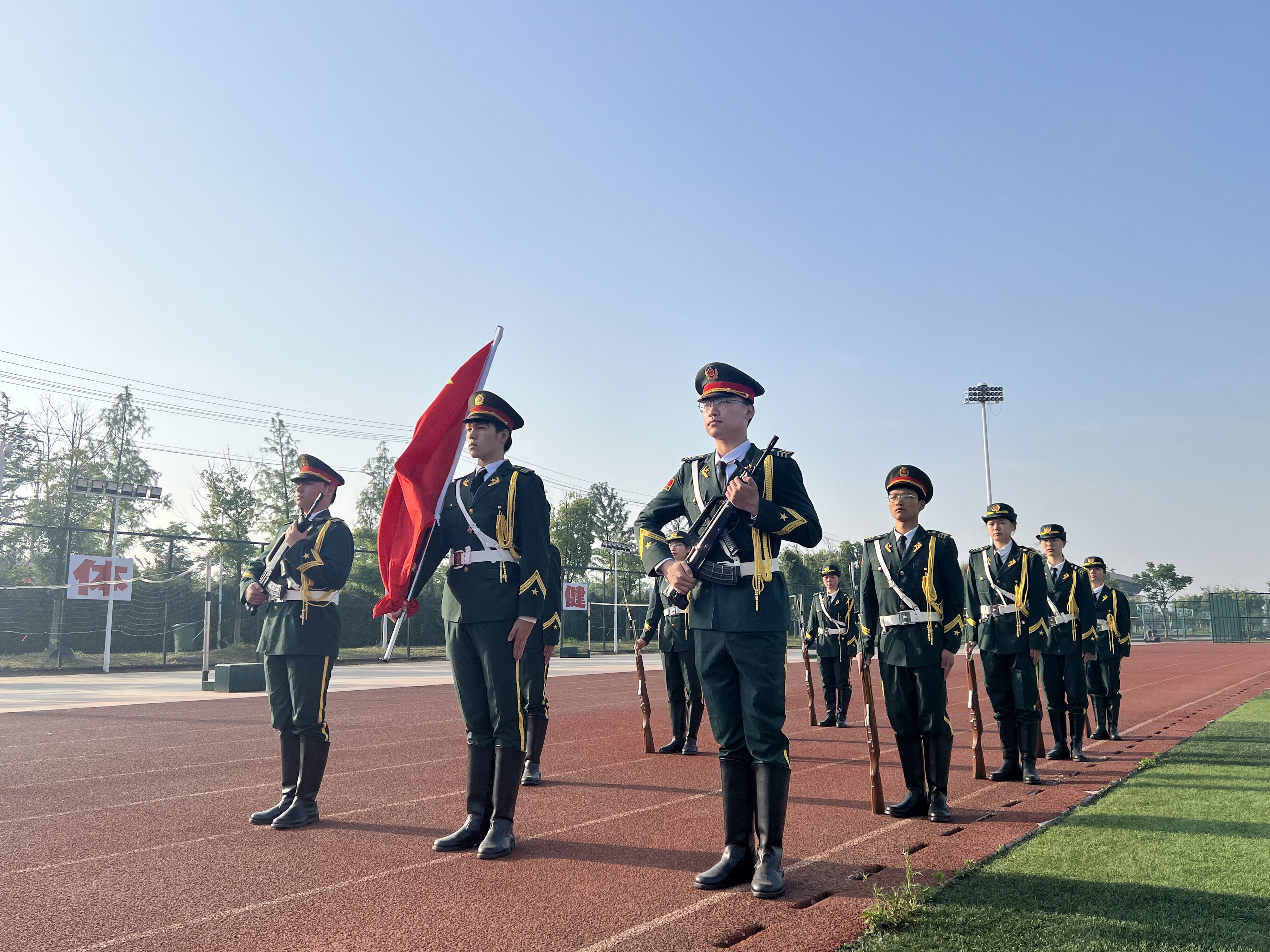 国旗护卫队昂首阔步,护卫着五星红旗走向升旗台,在激昂雄壮、催人奋进的国歌声中,鲜艳的五星红旗冉冉升起。全体师生庄严肃立,向国旗行注目礼,表达着对伟大祖国的无限热爱和由衷敬意。