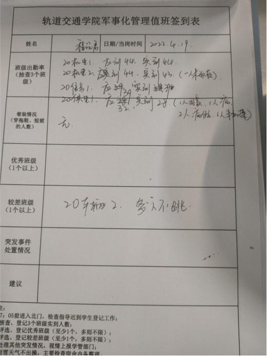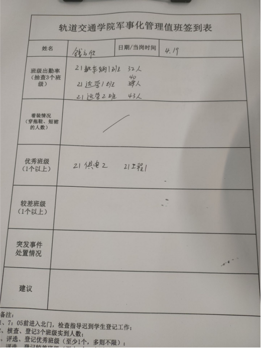 值班记录:今日应出操学生937人,实际出操920人,出操率为98.2%,较上期提高0.4百个分点;满勤班级17个,较上期多4个。今日早操整体状况较好,但跳操的积极性略有下降,请做好引导。较好班级为21工程1班21供电2班,精神状态好,跳舞整齐;较差班级为20车辆2班,大部分同学跳操积极性不高,多人不参与跳操;21信号1班,3人迟到。情况反馈: