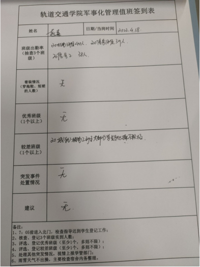 值班记录:今日应出操学生937人,实际出操916人,出操率为97.8%,较上期提高1.1个分点;满勤班级13个,较上期少1个。今日由赵喜老师组织了周升旗仪式,同学们都够准点集合完毕,全程庄严肃穆,效果好。同时进行了文明教室评选活动,21信号2班、21工程2班、21机电2班获得了红旗流动班级。早操整体较好,迟到现象有所好转,兔子舞整体水平提高明显,较好班级为21工程2班,出勤率高,精神状态好,跳舞整齐;较差班级为20机电2班,大部分同学跳操积极性不高,请抓好教育。情况反馈: