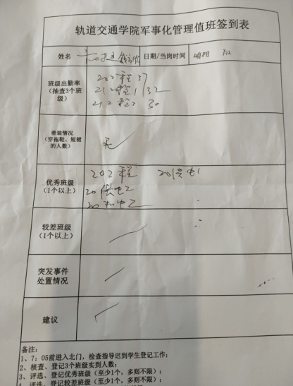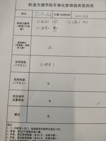 值班记录:今日应出操学生938实际出操913,出操率97.33%,较上期上升1.2个百分点;满勤班级11个,较上期多1个。今日早操好的方面是,大家积极性较高,迟到现象有所好转,兔子舞训练水平进一步提升,班级自由操时间组织更为得力。较好的班级是:20工程班,能够积极作为,班级自由操一直练习到8:00才结束;20供电1班、20供电2班、20机电2班,兔子舞练习认真,动作统一,自由操时间参与度高。较差班级为:20运营2班,20运营3班,未组织自由操活动,大部分人员在玩手机。情况反馈:无。
