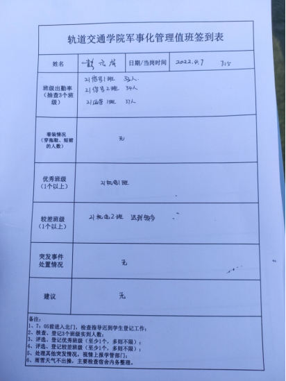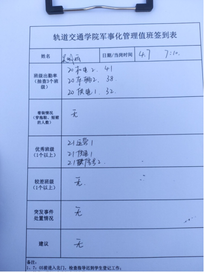 值班记录:今日应出操学生940实际出操905,出操率96.17%,较上期下降1.2个百分点,连续2天下降;满勤班级10个,较上期少2个。 今日是我院实行“网格化”早操的第2天,利用早操机会,由值班老师领学了《关于肥西县阳性感染者活动轨迹的补充通报》,引导学生要严格遵守校规校纪,切勿出现翻墙行为,疫情防控从我做起。今日早操,好的方面是,大家积极性较高,能够认真地参与兔子舞及班级自由操的练习,但也存在早操到位率不高,迟到现象凸显的问题,希望各班加以教育引导。较好的班级是:21运营1班、21供电1班、21信号2班、21机电1班,兔子舞练习认真,动作统一。较差班级为:21机电2班,迟到人数比较多。情况反馈:无。